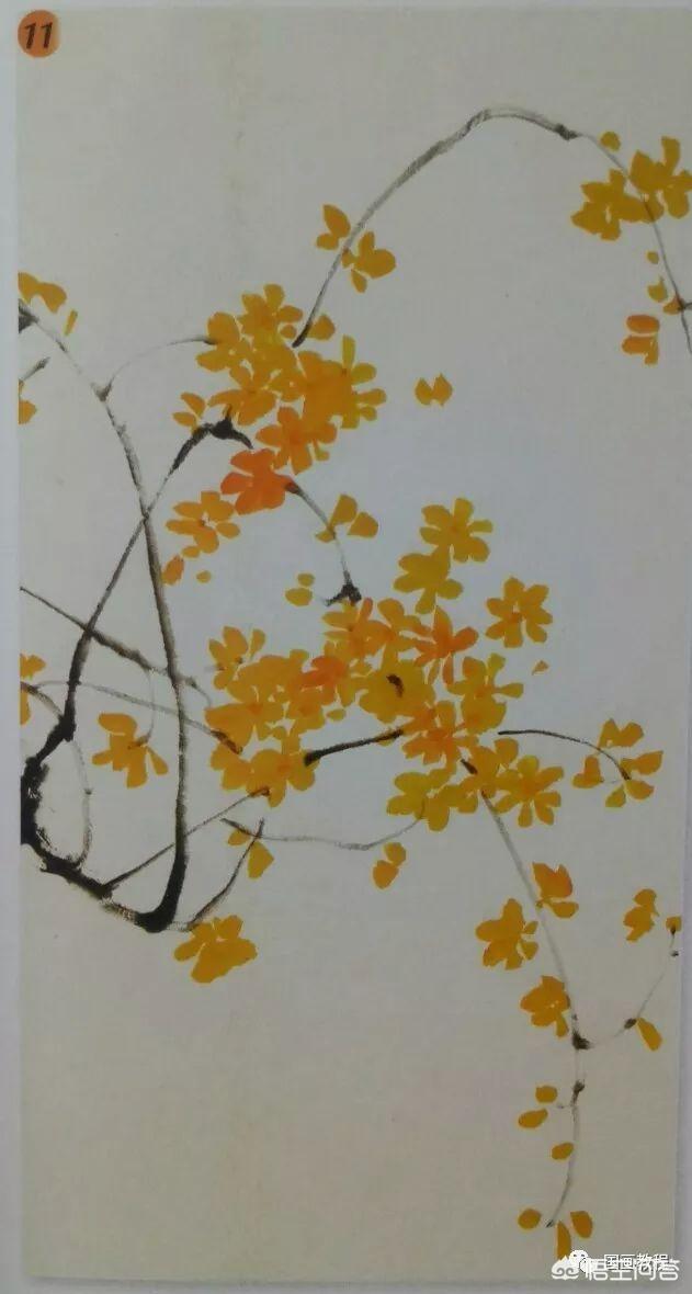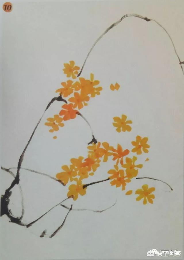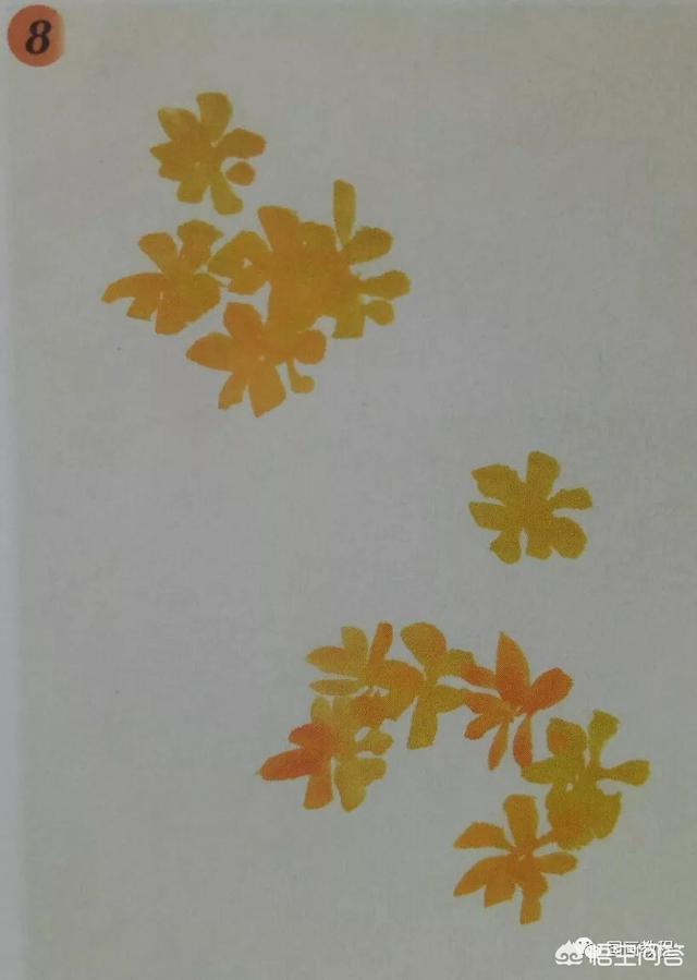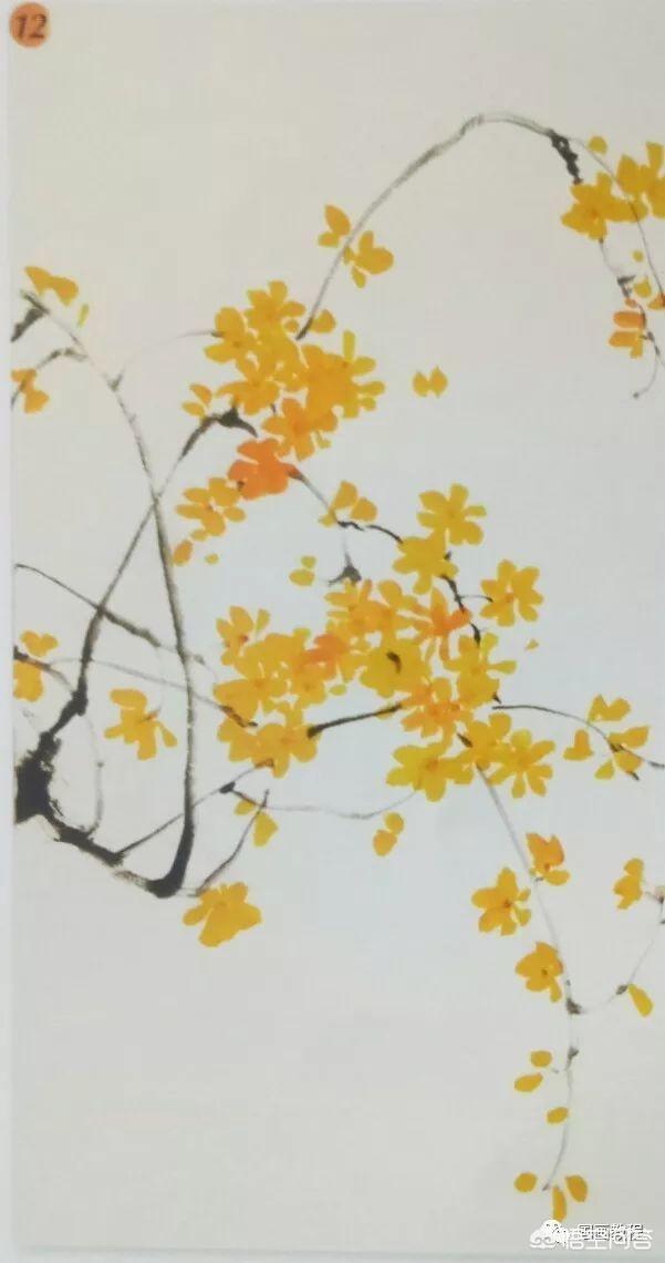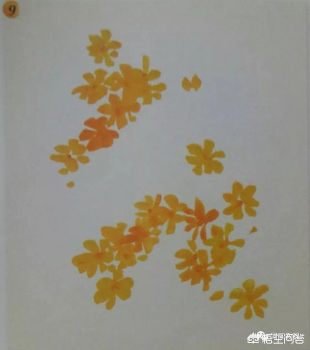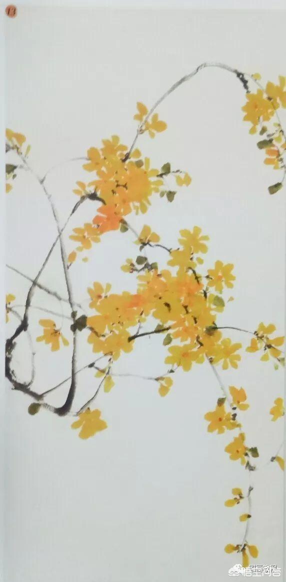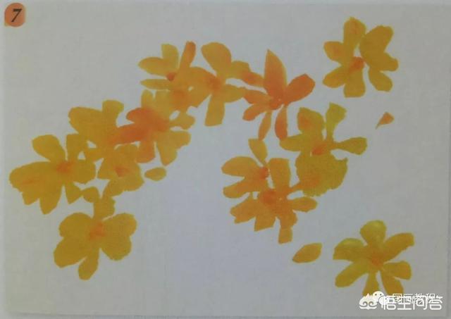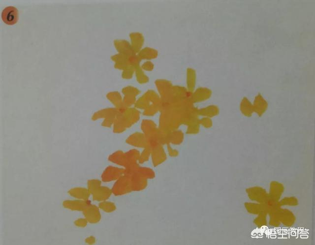 步骤7:要表现春光灿烂的意境,需要多画花朵,迎春花在春天绽放时,花居多、叶很少。大量花朵在画面的布置和安排中,略一看应似两簇花团组合在一起。要做到聚散有度、疏密合理。