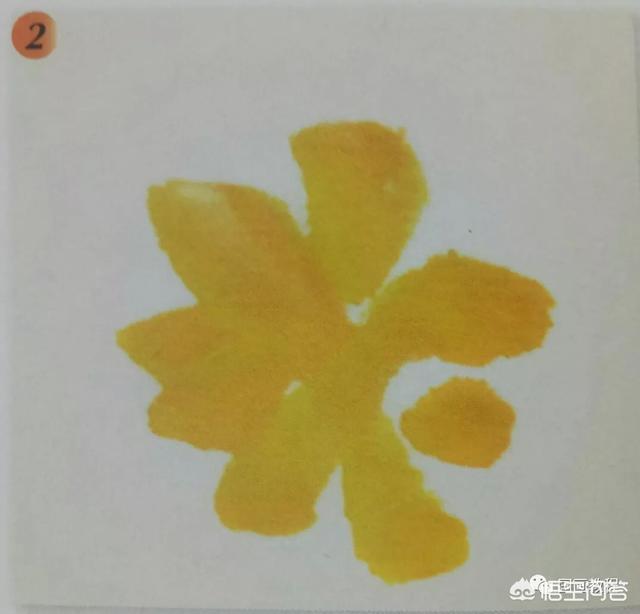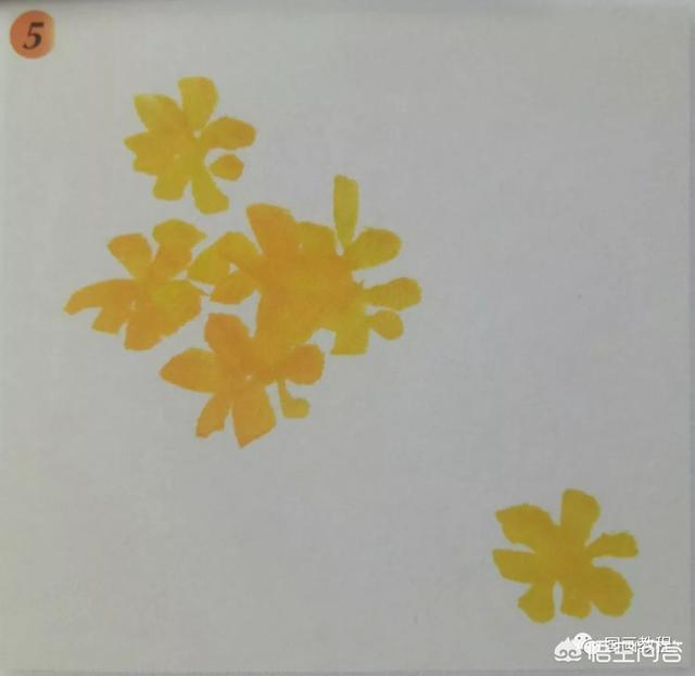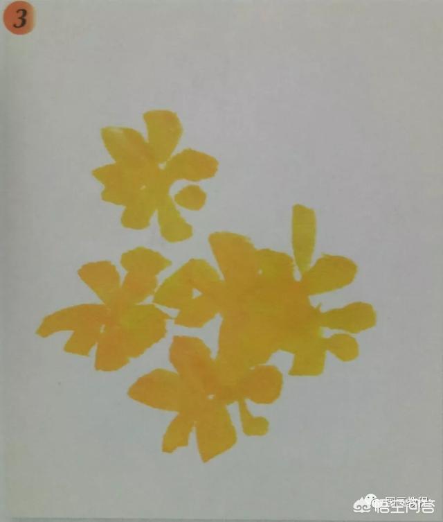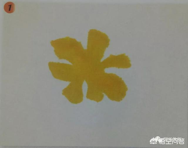 步骤1:用小羊毫笔,颜色为鹅黄调白粉,迎春花有六瓣,画时要有变化,有正面、侧面、背面之分。此朵为正面。