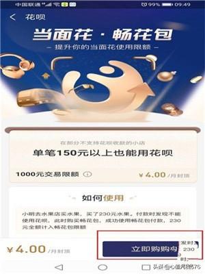 3.第三步花呗当面花畅花包单笔大于150元且当月累计在200元以上的,每200元收费1元,封顶是4元